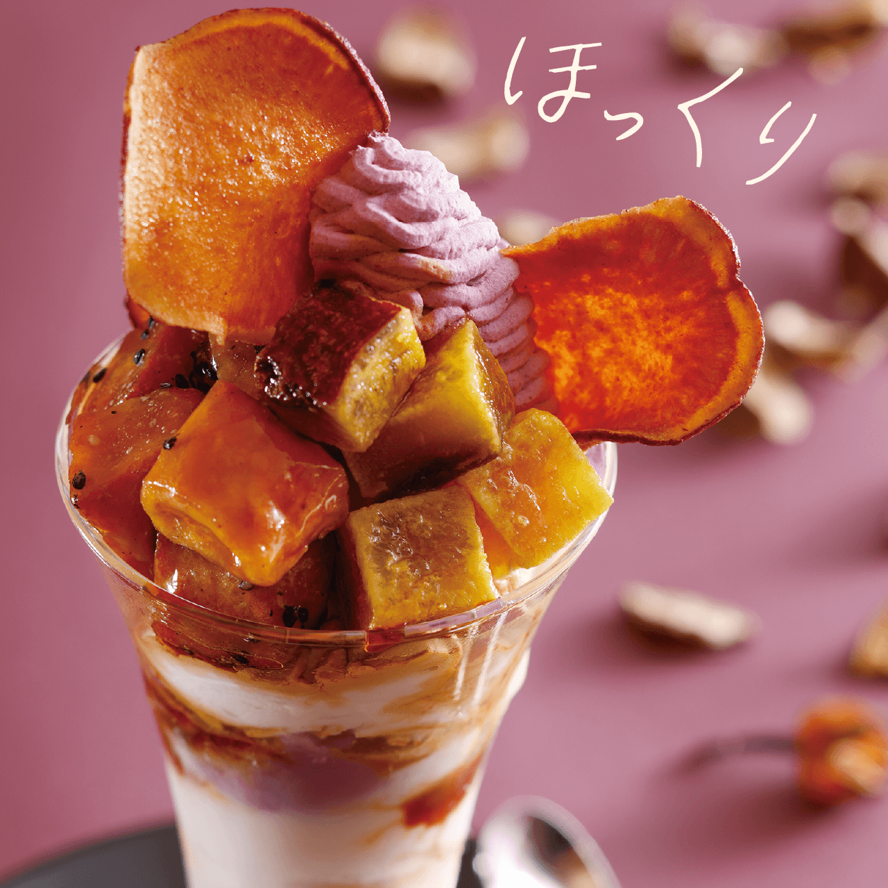 紅芋を使ったアイスと特製クリームを使用し、大学芋とさつまいもチップスをトッピング。秋の味覚をぎゅっと詰め込んだ「おいもパフェ」1,900円。ドリンクセット+500円。