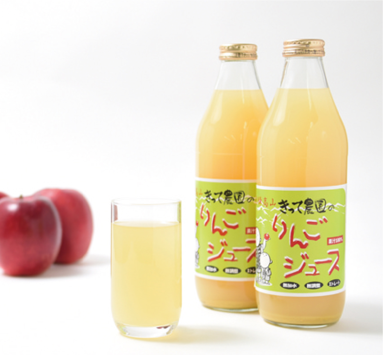 久々野町の果樹園〈KITTE FARM〉より、農園で採れたりんご使用のストレートジュースを2名に。ジョナゴールドのさわやかな風味を楽しんで。