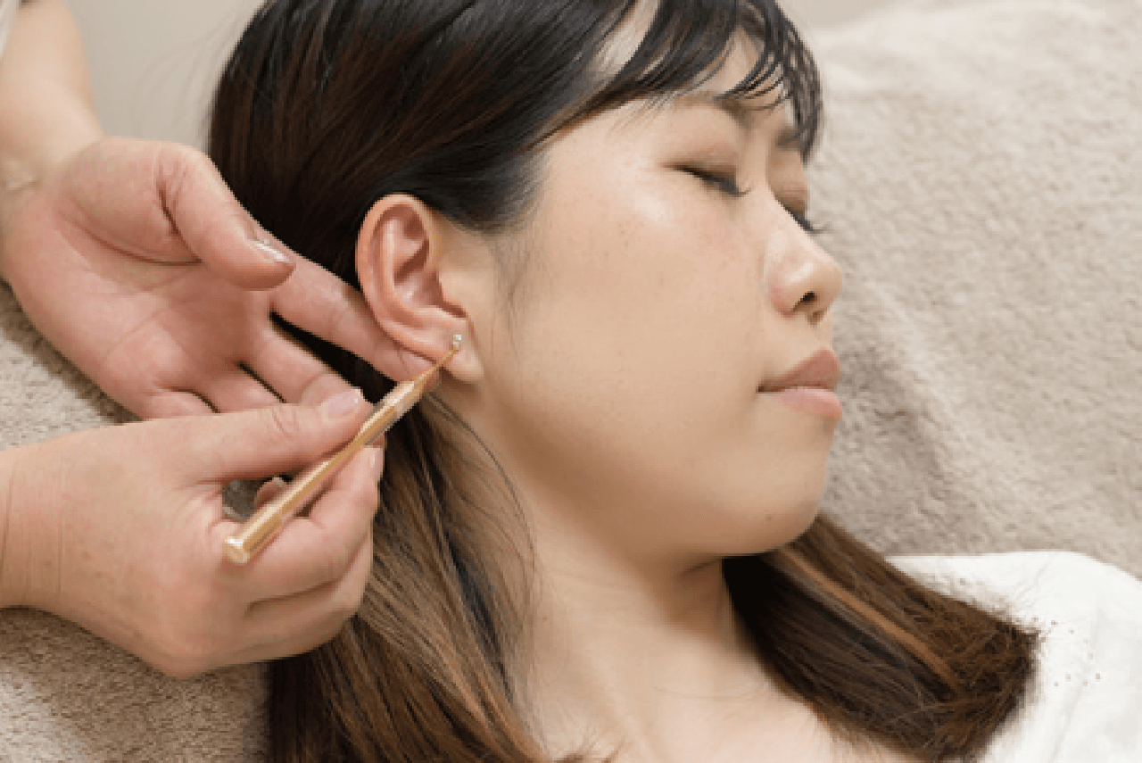 スワロフスキーが輝くチタン粒シールでツボを刺激しフェイスラインすっきり!さらに耳ツボはリラックス・自律神経・むくみ改善にもアプローチ。プラス水素吸入で心も体も軽やかに。