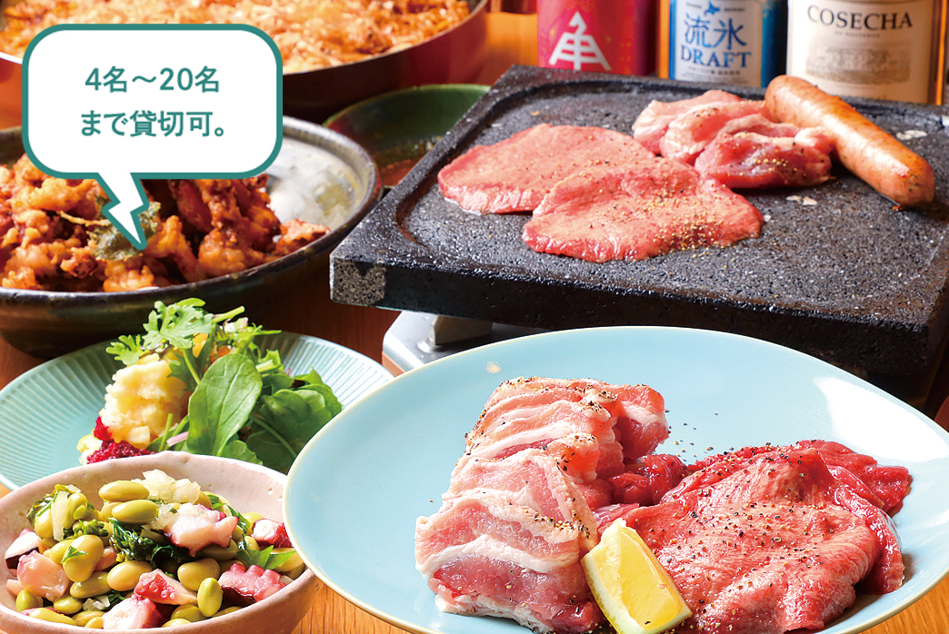「朝日町一番街」の落ち着いた空間で、飲み放題付きの焼肉宴会を。1グループ最大16名まで利用可。単品メニューもあり。