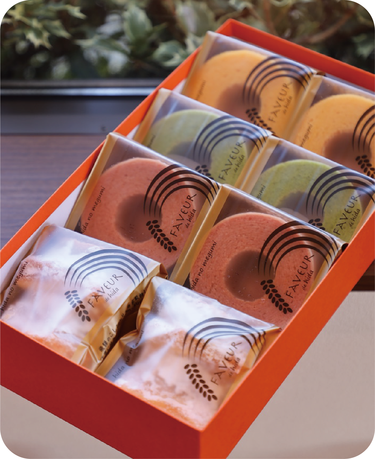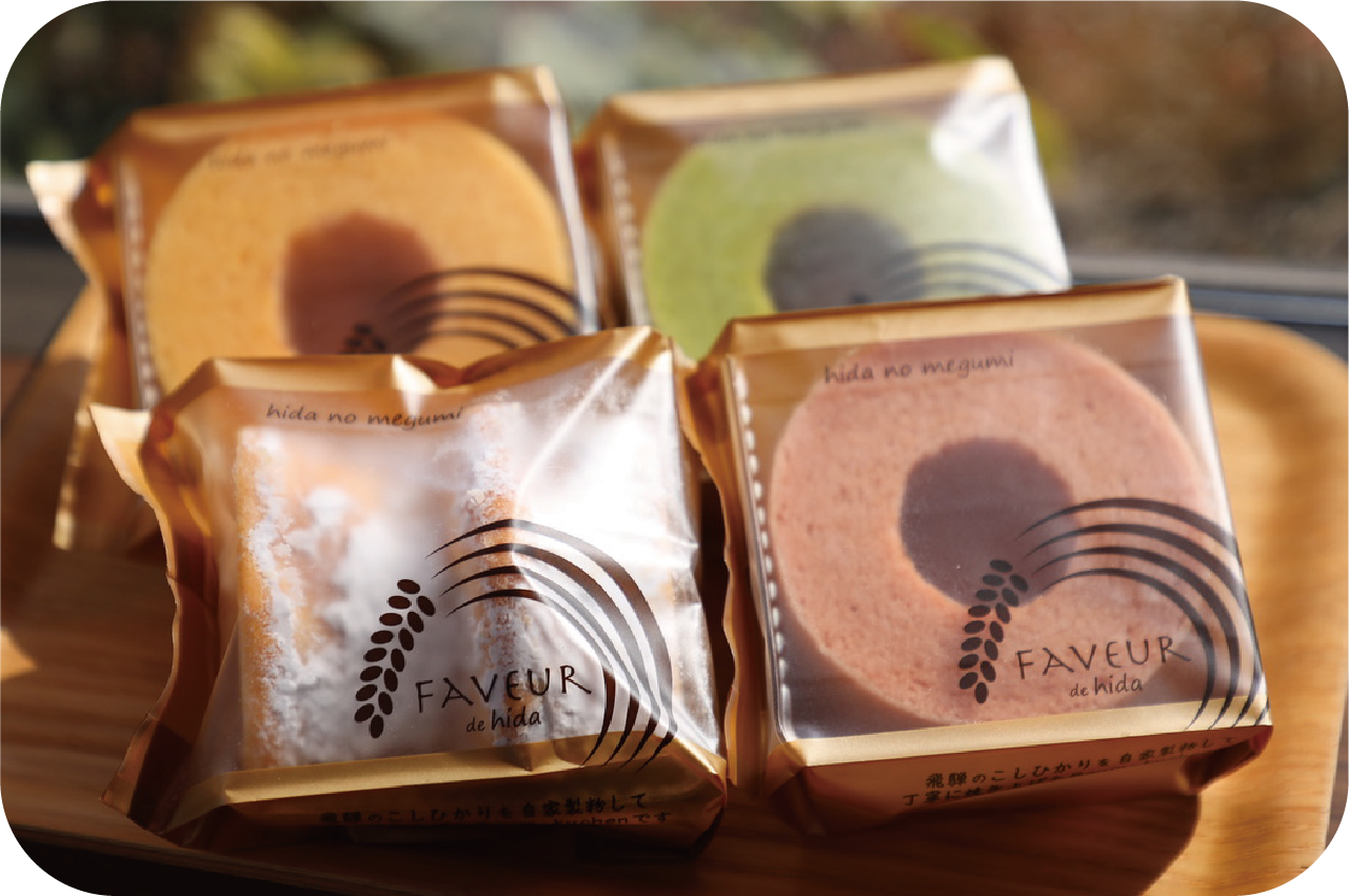 飛騨の特産である野菜や果物を使用し、ていねいに焼き上げたバウムクーヘン。どの世代にも安心な味わいは、お家でのおやつや贈り物にも最適だ。