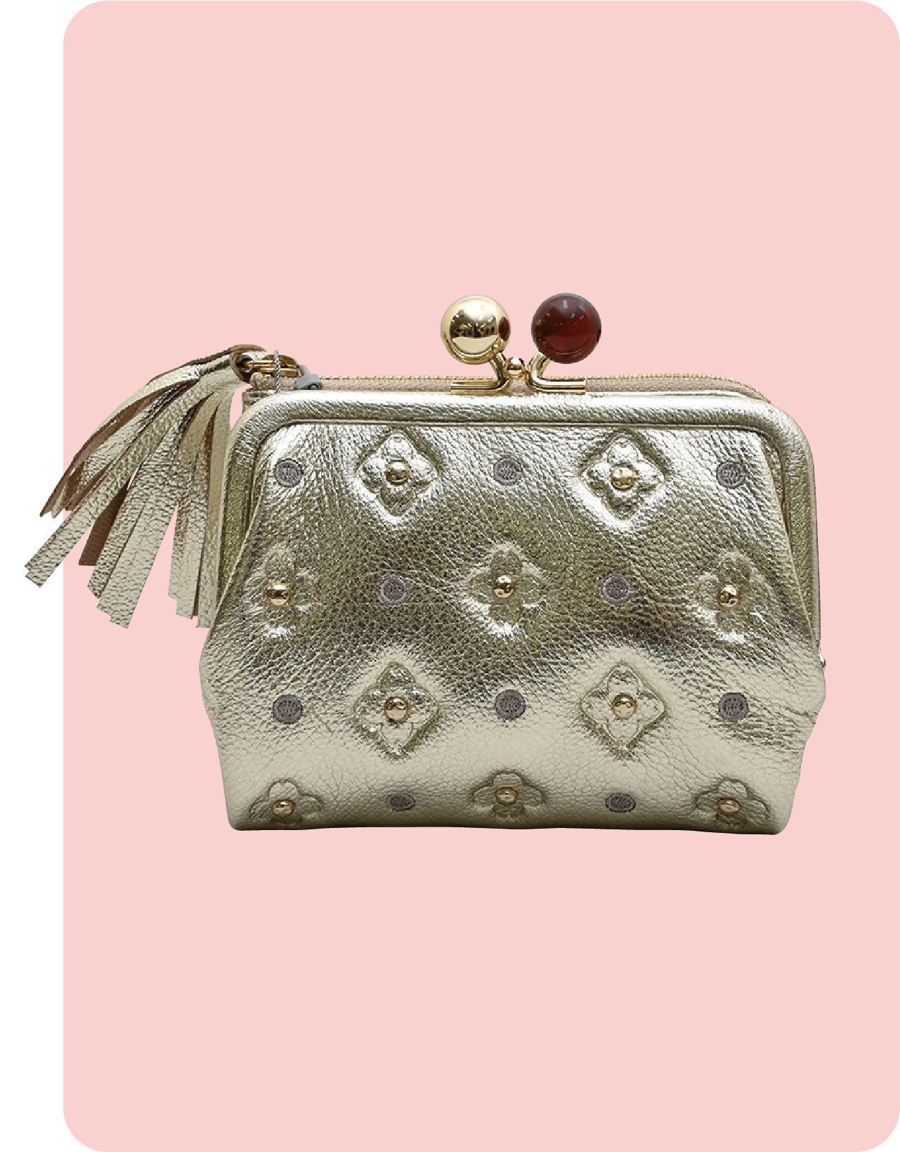 サクラをモチーフにした、スタッズとモノグラムにドット刺繍を組み合わせた春らしい財布。山羊革を使用し、ふんわり柔らかな手触り。がま口は大きく開くため、小銭の出し入れがスムーズ。