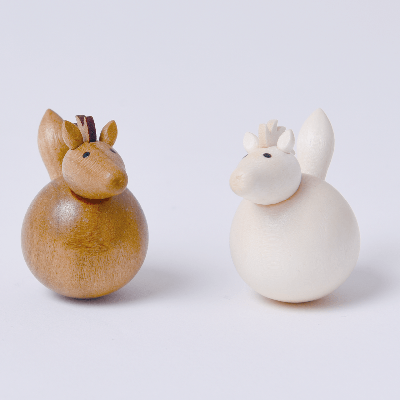 来年の干支は午。木のやさしい風合いと愛くるしいデザインが人気の起き上がりこぼしを。