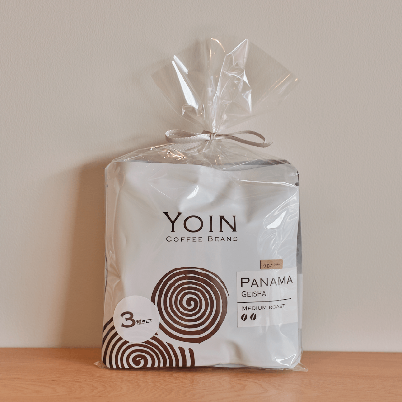 約20種の珈琲豆が並ぶ焙煎所おすすめのドリップバッグ3種セット。ゲイシャを含むフローラルな香りをテーマにした詰め合わせをプレゼント。
