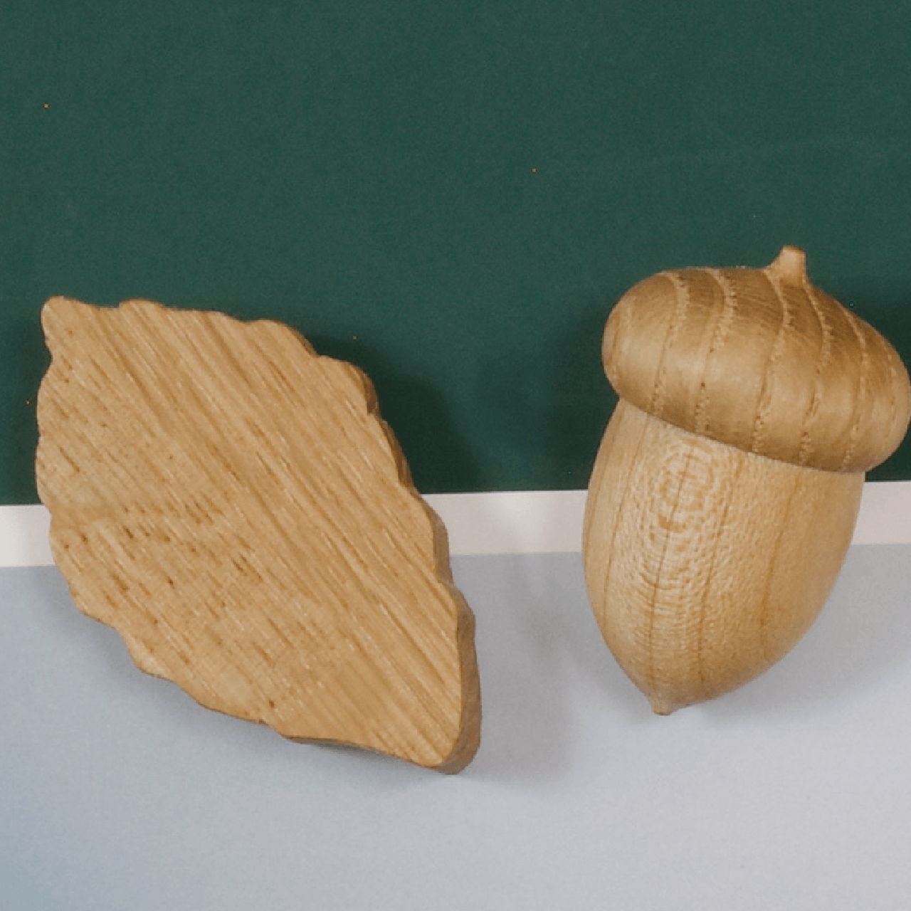 オークヴィレッジの森の木から作ったマグネット。どんぐりと葉っぱのセットでプレゼント。