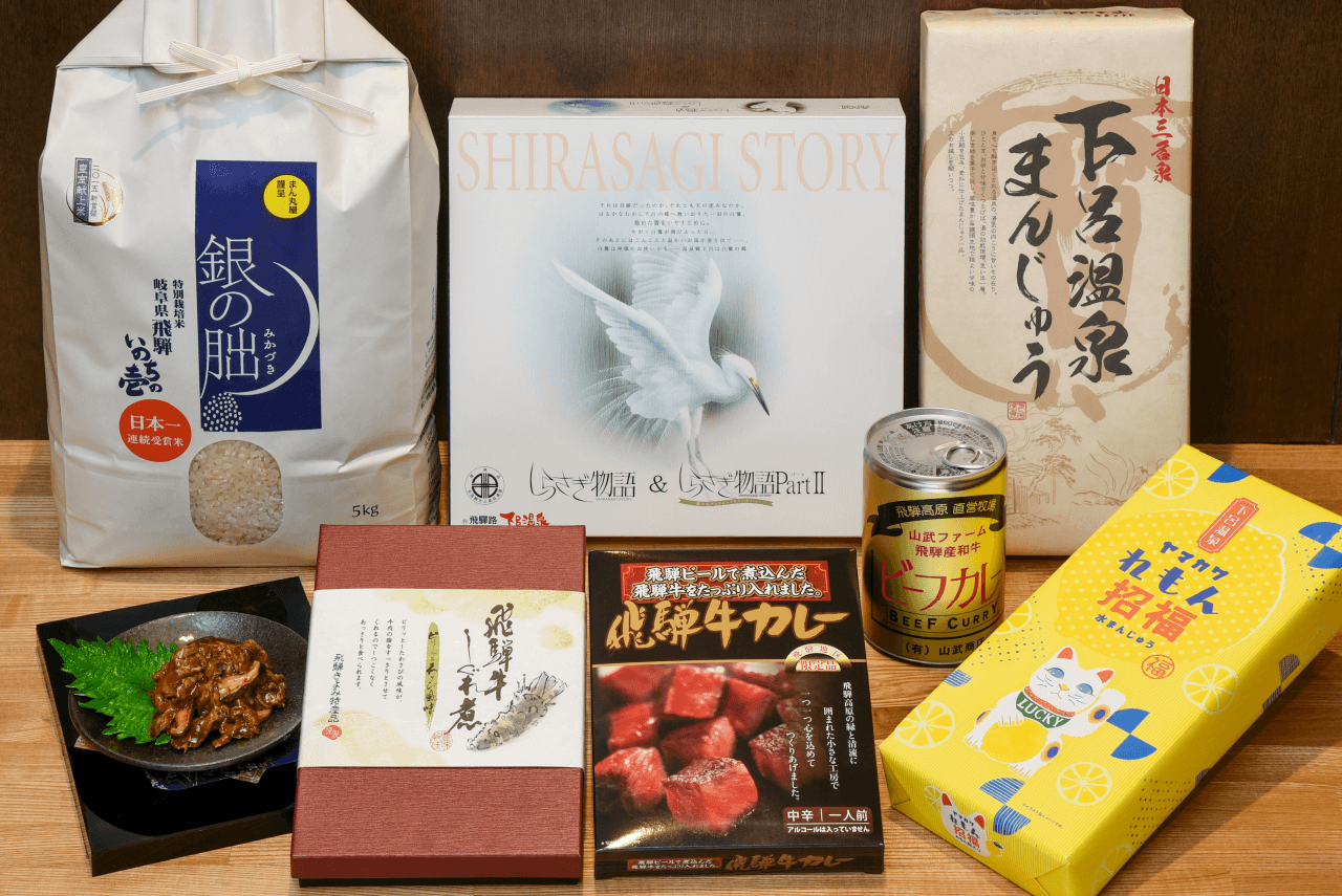 下呂温泉と共に歴史を紡いできた、巨大招猫が目印のお土産処。店内には、名産の工芸品から飛騨の各酒蔵が鎬を削って造り出される地酒、飛騨牛を使った食品や定番のお土産品まで取り揃う。店舗も下呂駅にほど近く、駐車場も完備で帰りも安心。心置きなく旅の思い出を選んでほしい。