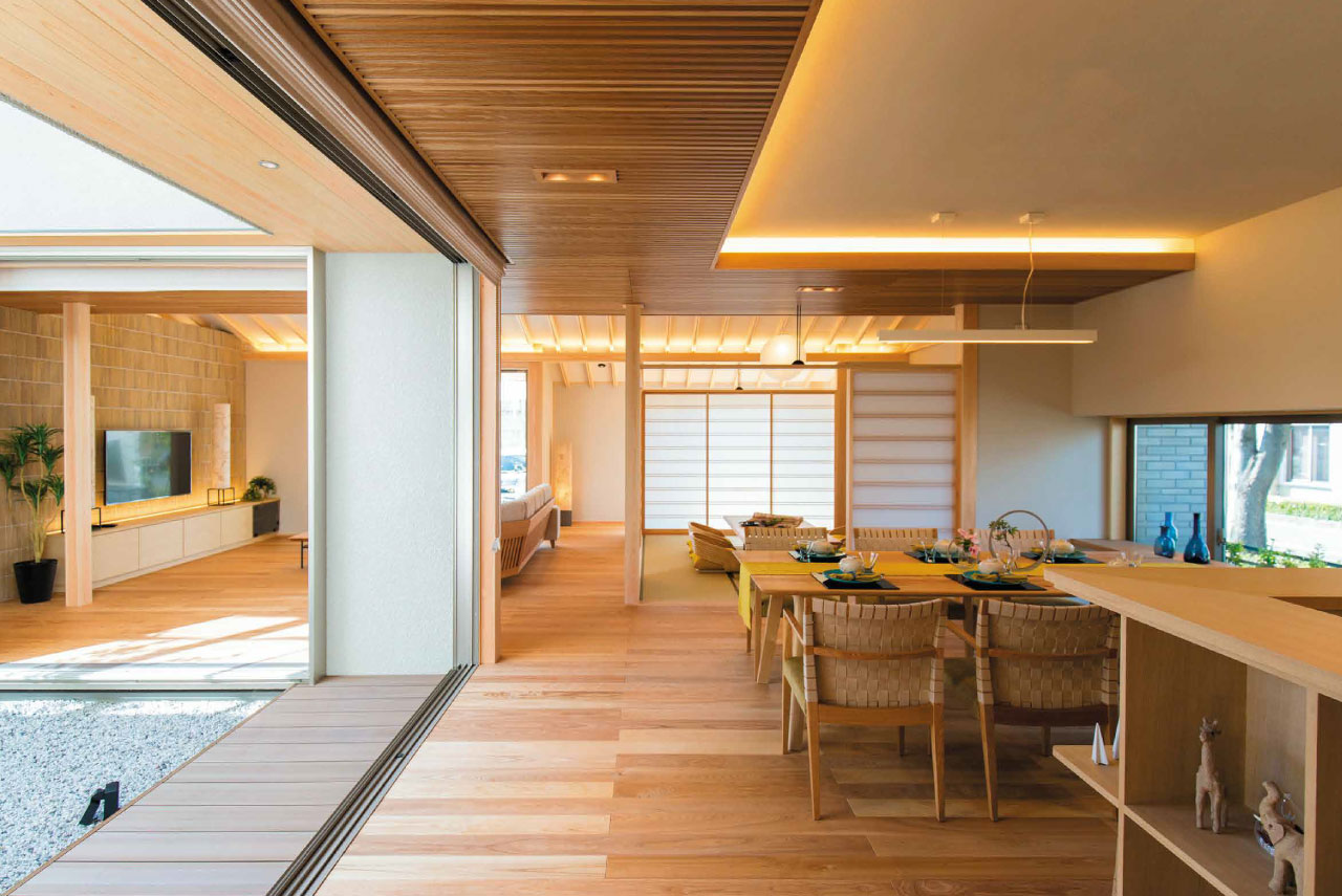 木目の美しい国産材を使い、日本の住まいに求められるさまざまな機能を備えた住まいづくりを行う〈新和建設〉の家。