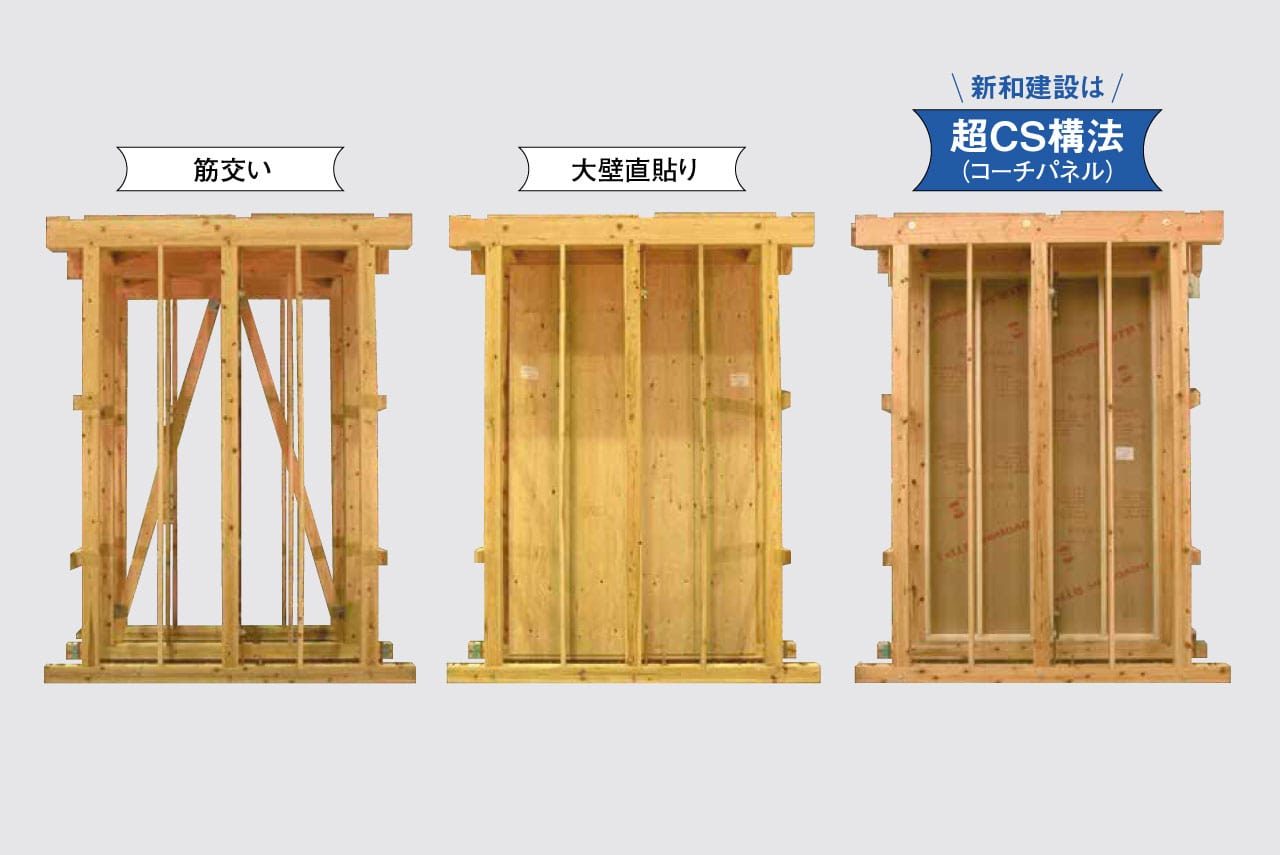 「桧の木造軸組」と「耐震パネル」を一体化した超耐震のモニコック構造で建てる「超CS構法」。