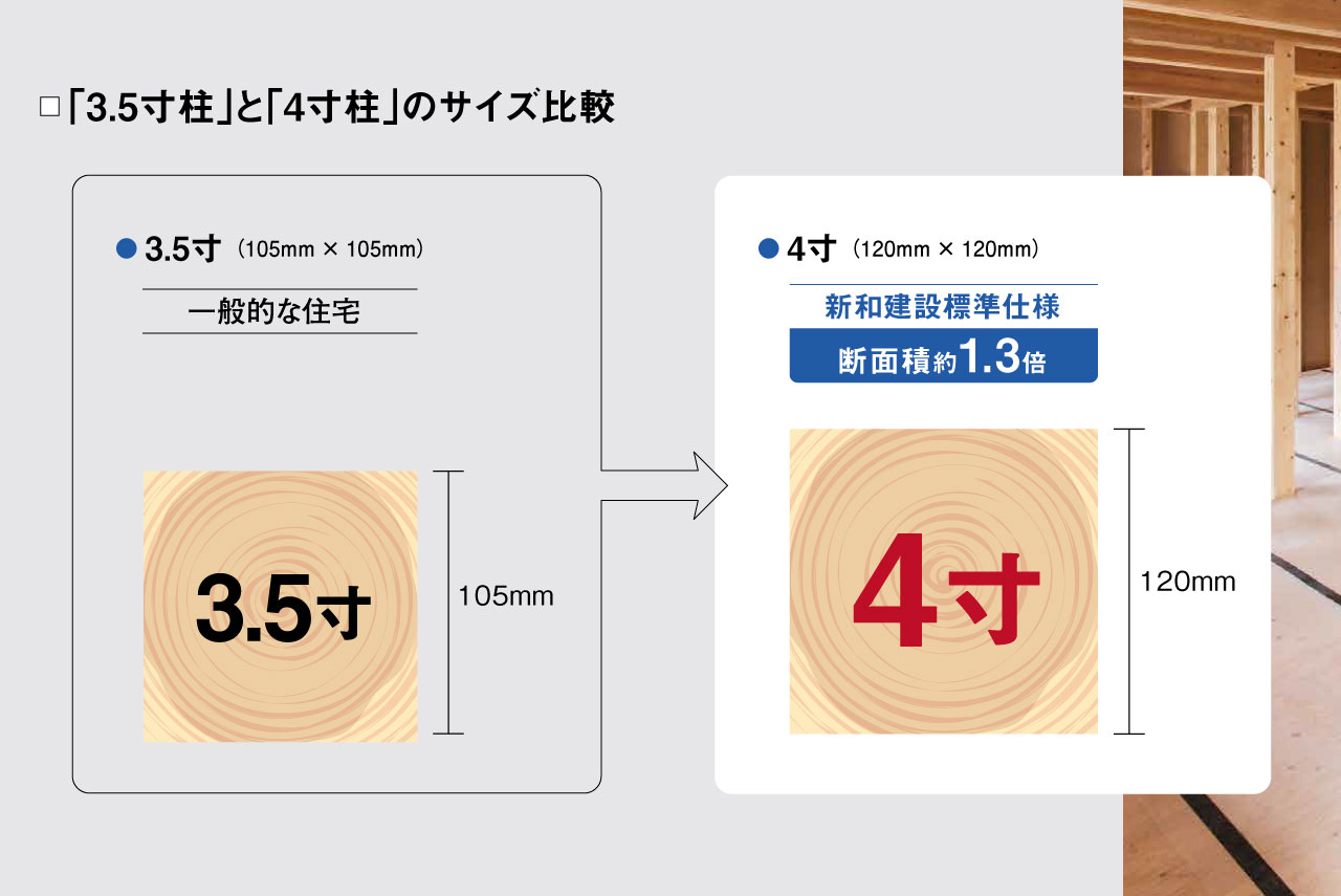 一般的な柱の太さより、さらに耐震・耐久性を増したオール4寸(120mm×120mm)が標準仕様!