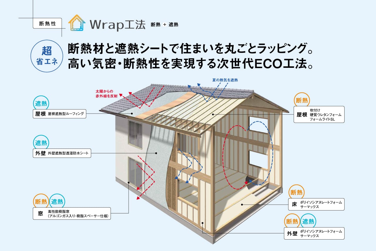 断熱材と断熱シートで家を丸ごとラッピングする「Wrap工法」は、高い性能の断熱材を実現する次世代のECO工法だ。